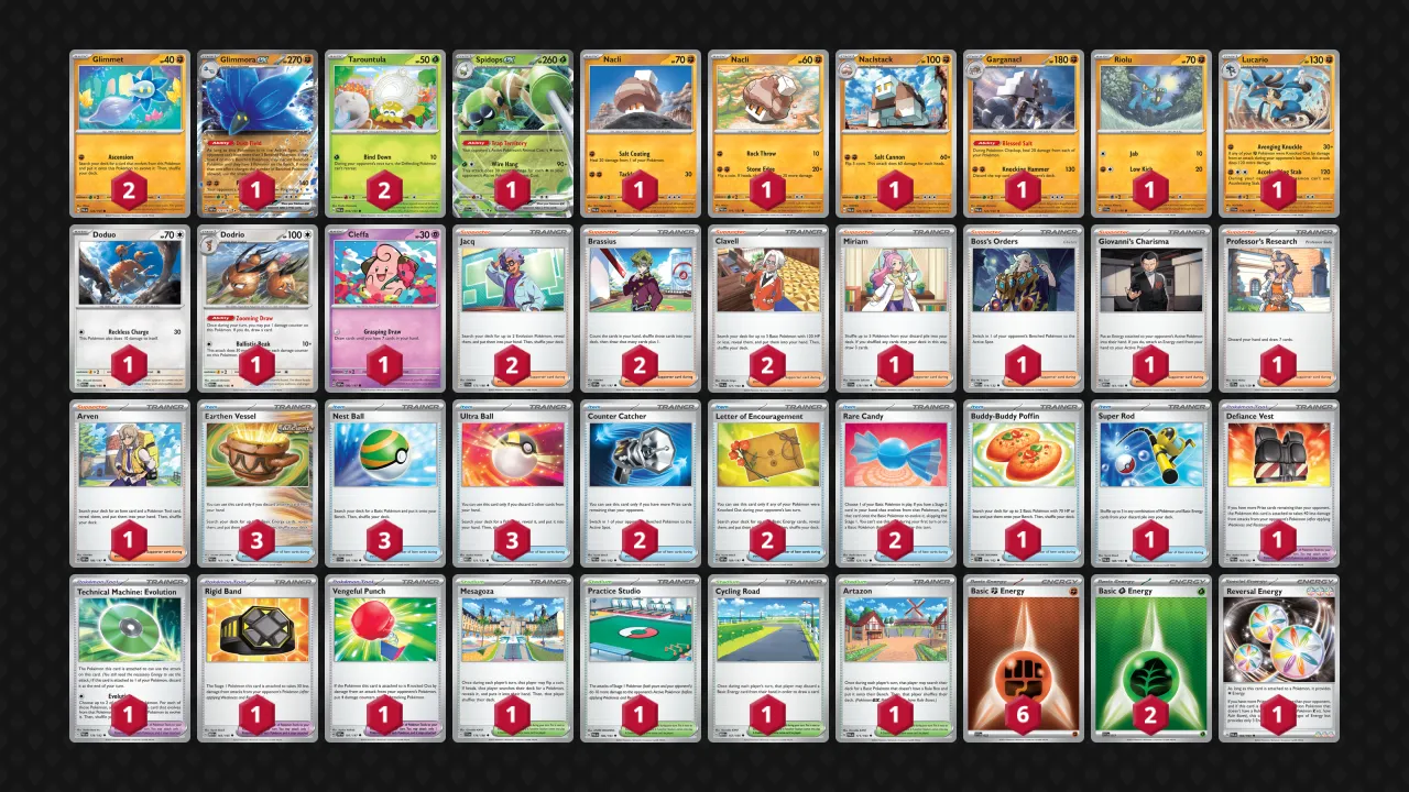 I decided to go back to my roots of fighting + Spidops and Dodrio. Spidops ex is mostly there to counter Charizard ex, Glimmora ex is my main attacker + limits their bench to 3. I now play two Garganacls: one that heals and another that accelerates fighting energy from discard. Lucario is efficient revenge attacker once the opponent KOs some of my fighting monsters. Dodrio is my draw engine and late game efficient attacker and Cleffa is there to save me from horrible hands.